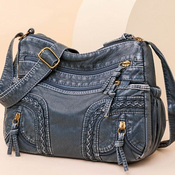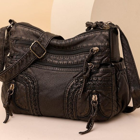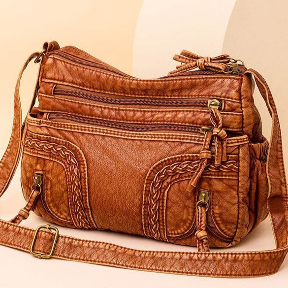 The Dora Shoulder Bag has a super cute retro washed leather design, effortlessly cool. Its woven shoulder strap adds a touch of uniqueness, perfect for the modern fashionista. Crafted from high-quality materials, this bag is durable and functional for any occasion. Elevate your look with this must-have accessory.