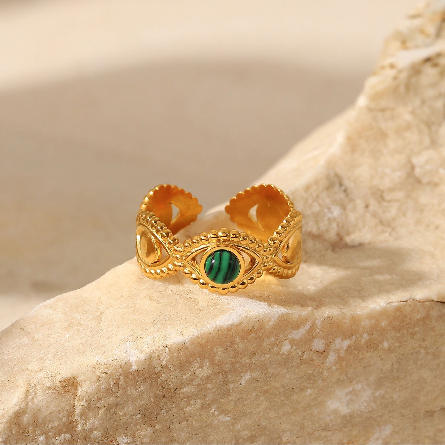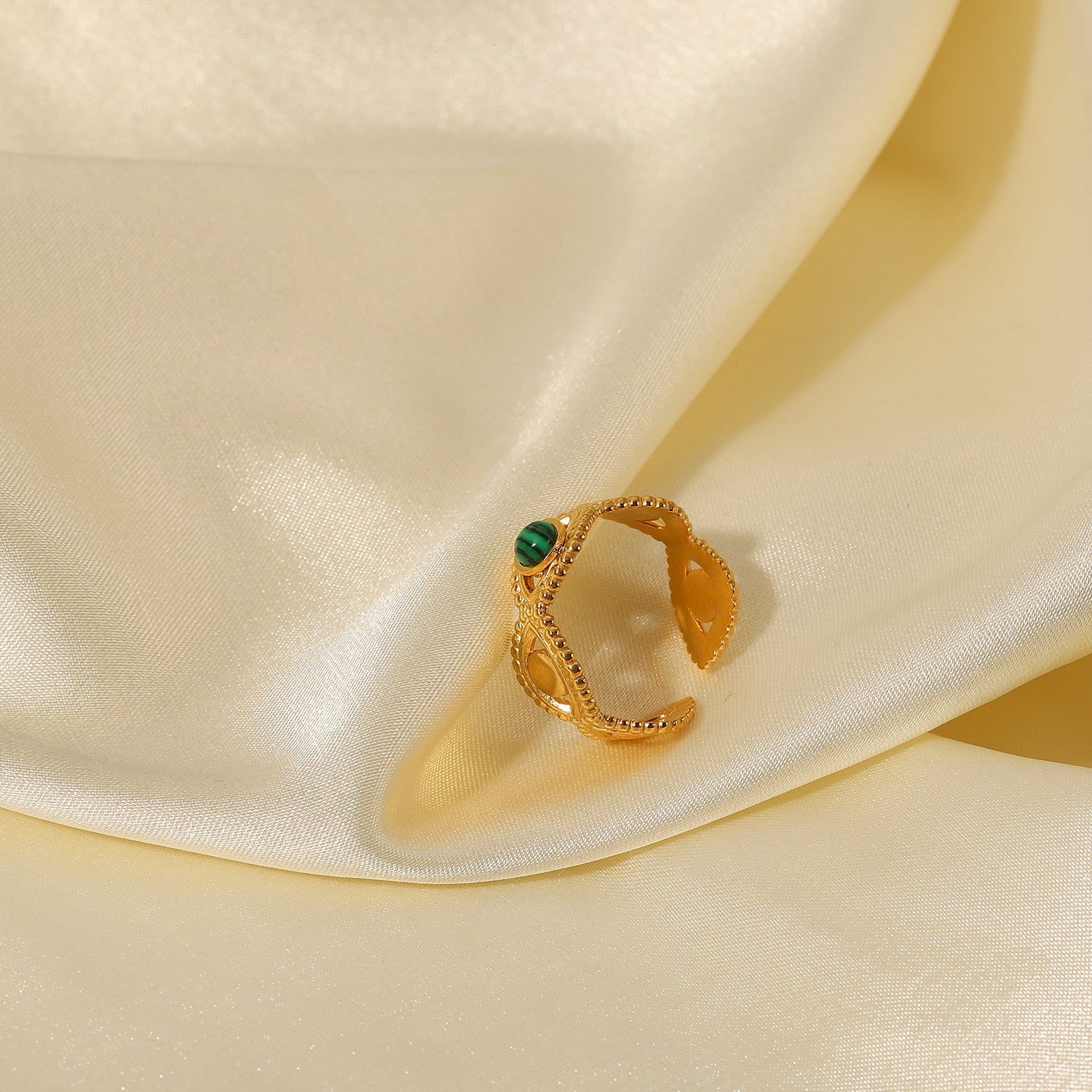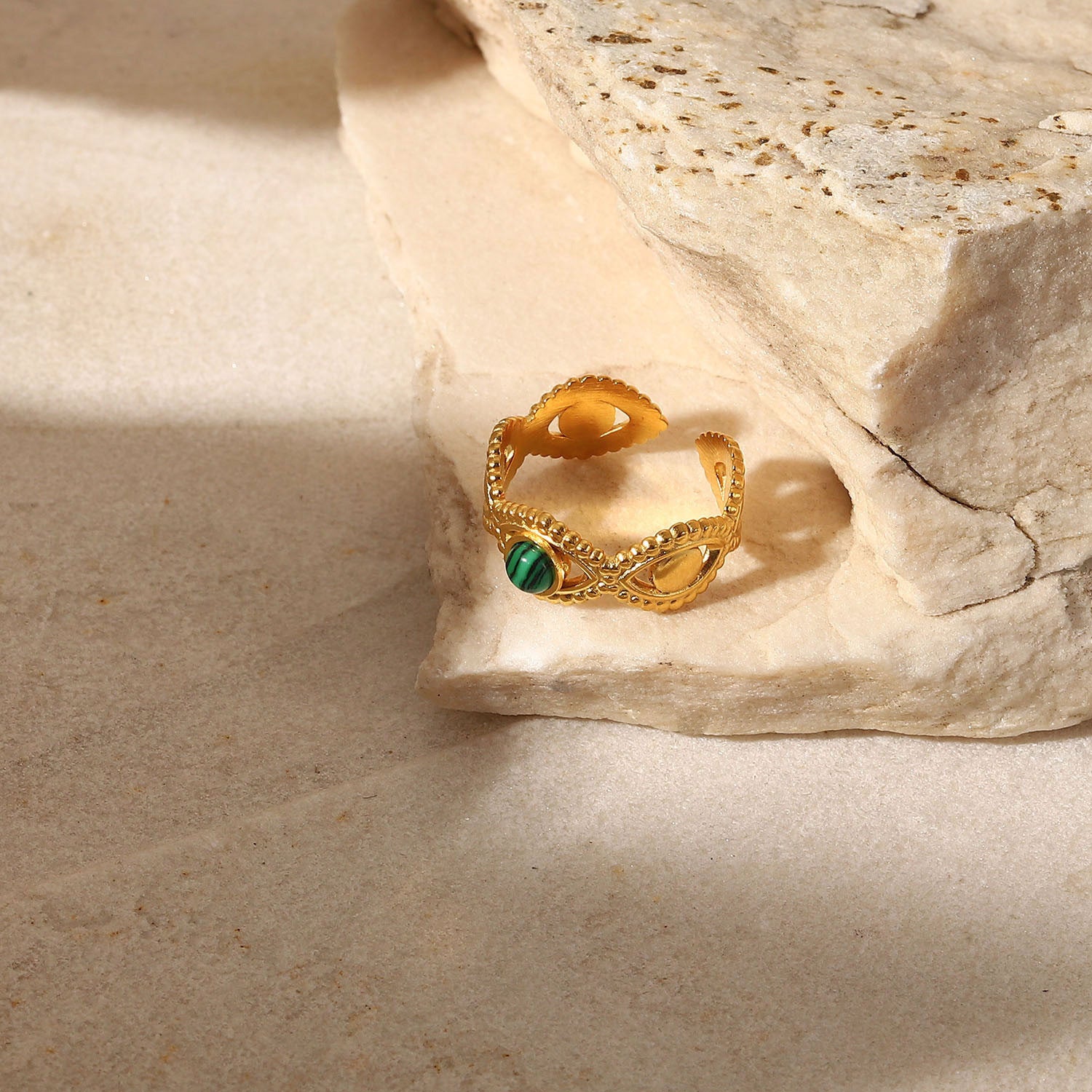 Introducing our stunning 18K Gold Stainless Steel Emmy Ring, a perfect blend of European luxury and durability designed to elevate your everyday style. This adjustable ring combines delicate elements with the resilience of Stainless Steel. Gold plated. Safe to wear in water.