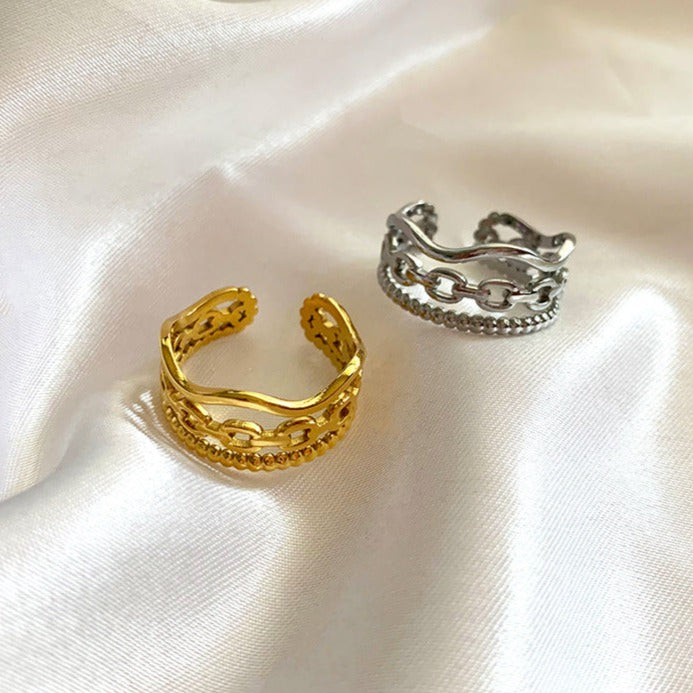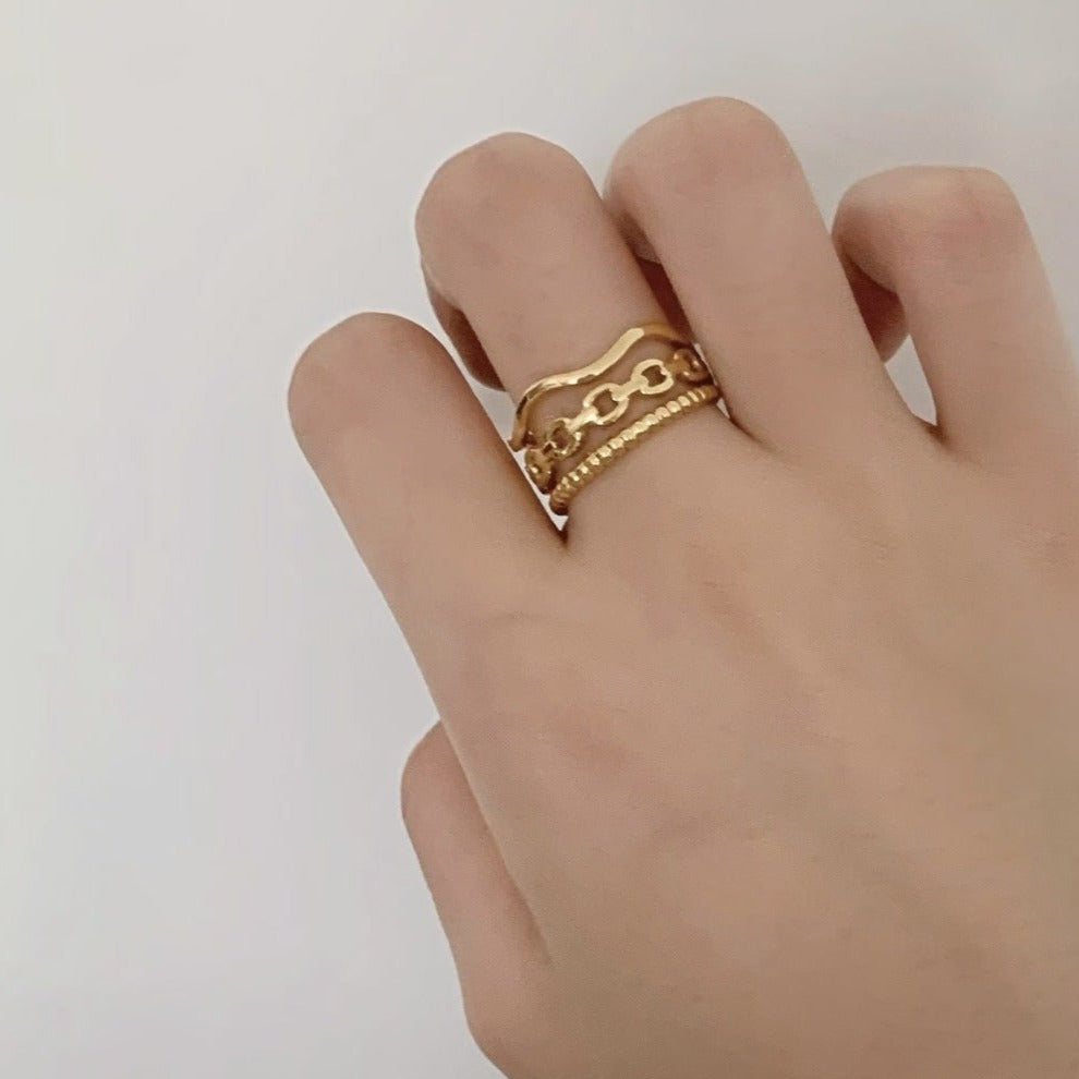 Introducing our stunning 18K Gold Stainless Steel Riley Ring, a perfect blend of luxury and detail designed to elevate your everyday style. Crafted with precision, this ring combines delicacy with the resilience of stainless steel, ensuring it remains a treasured piece for years to come. Safe to wear in water.